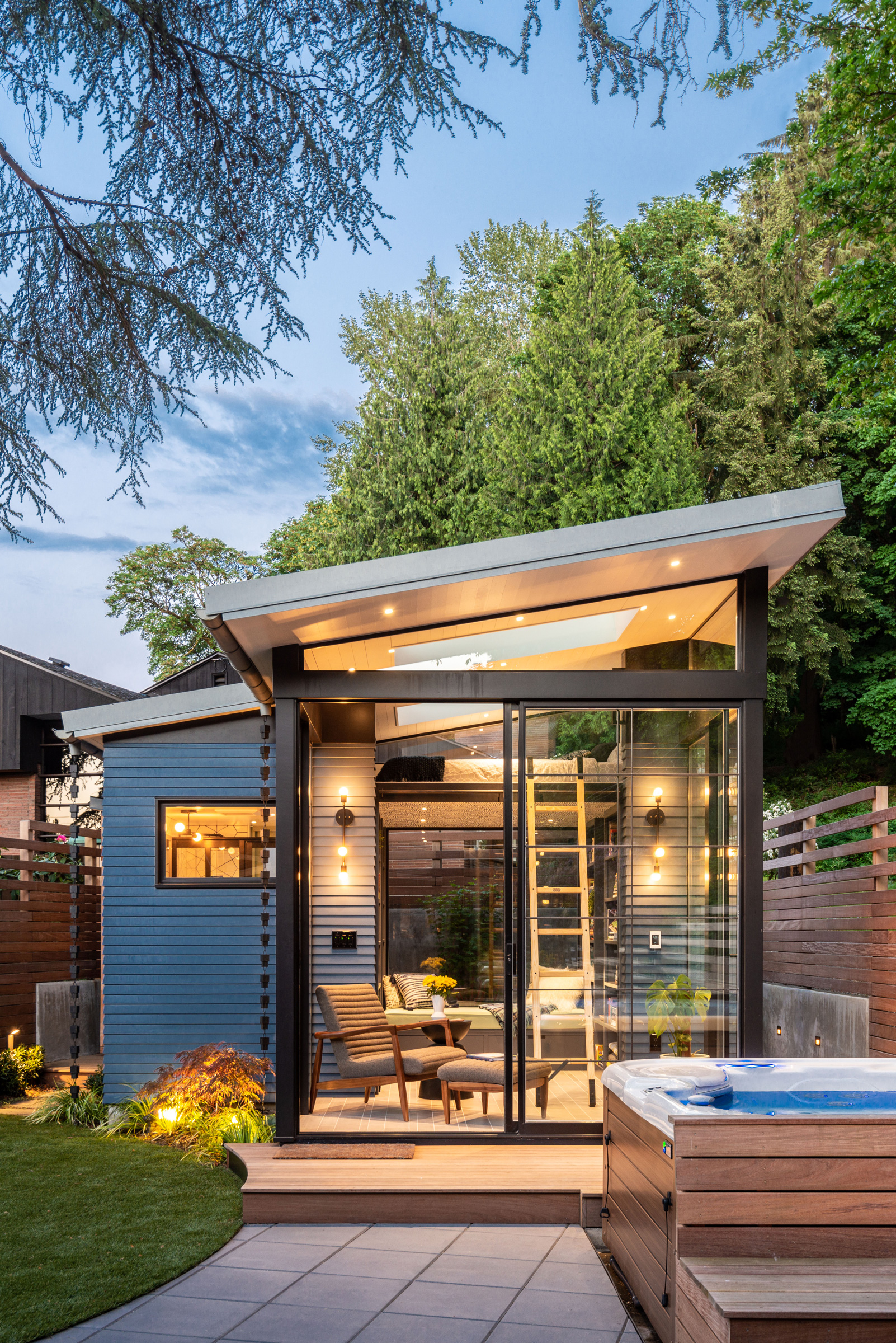 This versatile space can be used as a reading room, a guest suite or for entertaining. Inside, there’s a modern bathroom and a ladder to a loft and sleeping space. Outside, it features an additional shower for an easy rinse heading in or out of the sauna or hot tub and a wrapping deck and patio connect it to the firepit and the main house. Whether you call it a backyard cottage, a shed or a garden retreat, this is an oasis in the city.
